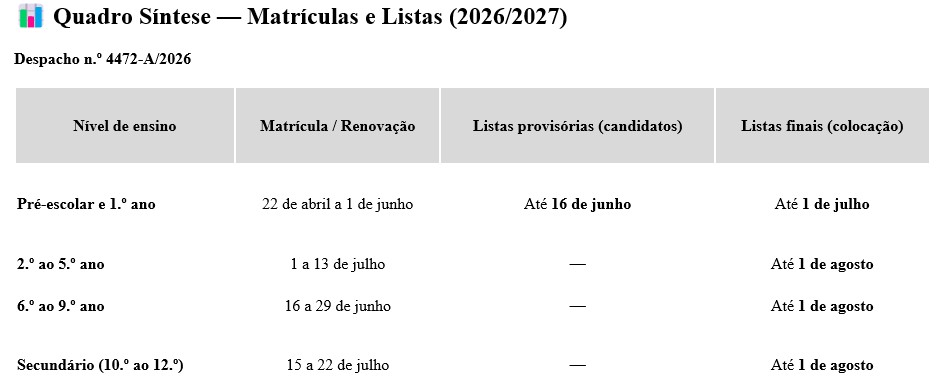 Calendarização das matrículas e respetivas renovações para a Educação Pré-Escolar e para o Ensino Básico 2026/2027